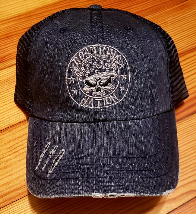 Herringbone Distressed trucker cap embroidered with the Road King Nation logo. Available in 2 Colors Navy/navy and Black/Grey